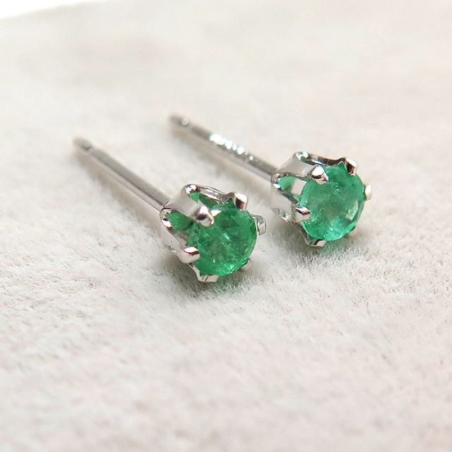 天然石エメラルド(ザンビア産・無処理)・6本爪ポストピアス(ラウンド3mm)「14kgf(ホワイトゴールドフィルド)(ロジウム)」(5ペア)